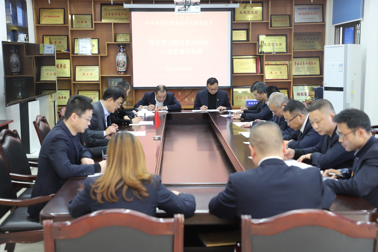 在参观爱国主义教育基地、召开党史教育专题学习会后,为进一步深化党史学习教育成果,传承红色基因,发扬优良传统,坚定党员的理想信念,4月8日上午,荣县水司党支部开展了党史知识竞赛,会议由党支部书记、执行董事、总经理龚庆主持,党员、入党积极分子及部分职工代表参与了此次竞赛。