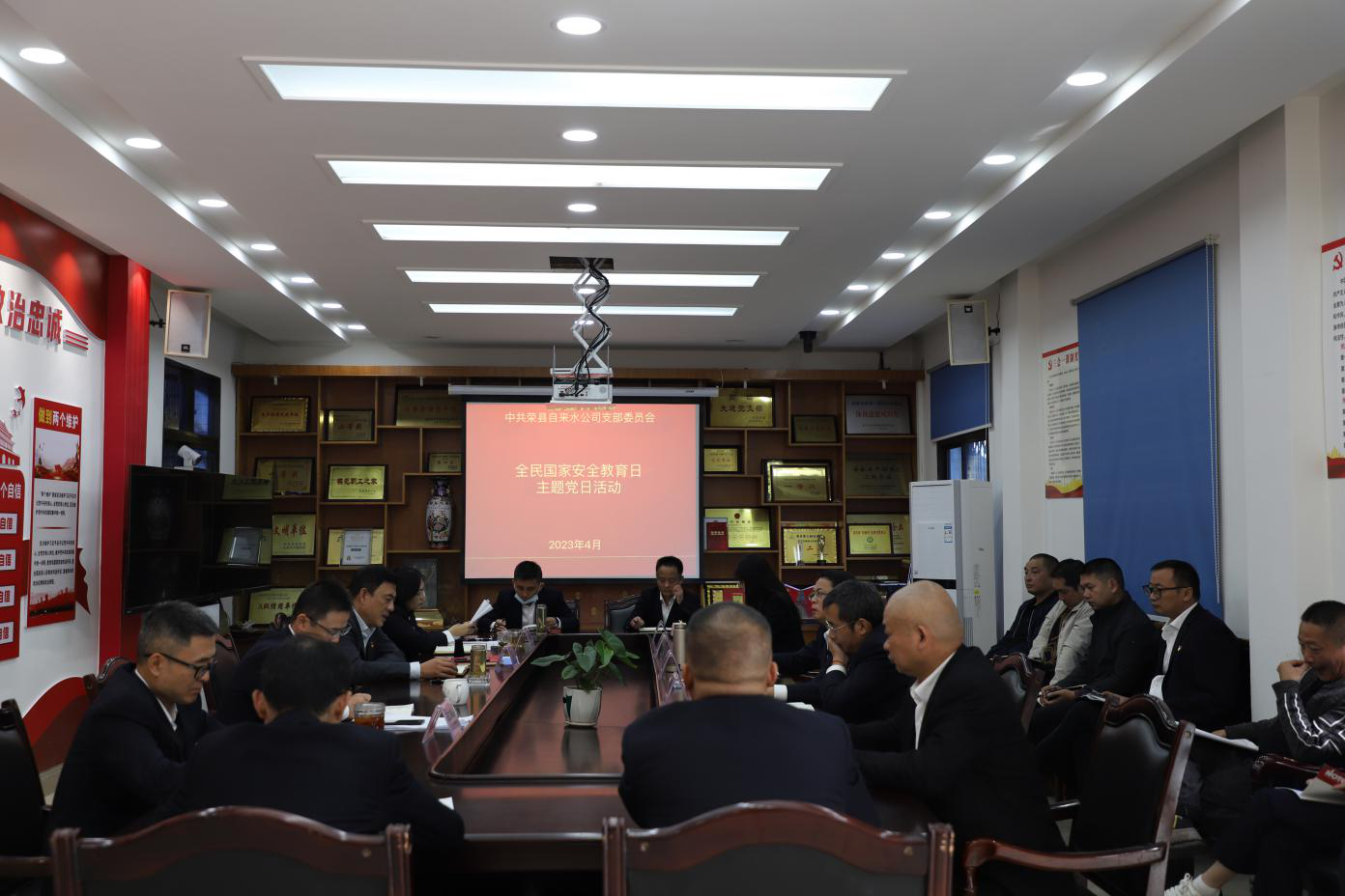 2023年4月13日上午,为进一步增强全民国家安全意识,营造维护国家安全浓厚氛围,在第八个“全民国家安全教育日”到来之际,荣县水司党支部组织开展全民国家安全教育日主题党日活动,荣县水司党支部书记、执行董事、总经理龚庆主持会议,领导班子成员、中层副职以上及全体党员参加会议。
