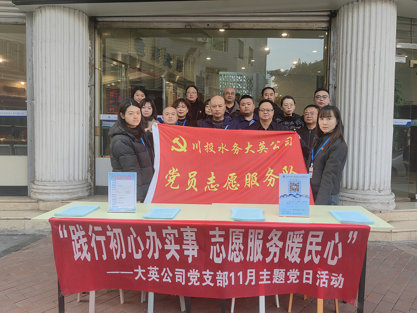 为提升供水服务品质,精准对接用户需求,11月27日上午,大英公司党支部组织公司全体党员、入党积极分子开展“践行初心办实事 志愿服务暖民心”主题党日活动。此次活动通过政策解读、业务咨询、水质答疑、便民服务及企业回访相结合的方式,与用户进行“零距离”互动交流,将便民服务送到用户“家门口”。