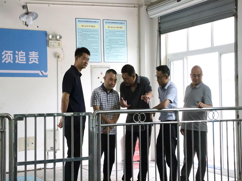 徐子锐一行首先深入生产厂区,对取水泵房、加压泵房、配电室、加药间、技改工程等重点区域进行实地检查。在检查过程中,对设备运行状态、安全防护措施落实情况进行细致排查,重点查阅了有限空间应急预案、防汛减灾工作方案及安全环保工作制度等资料台账。