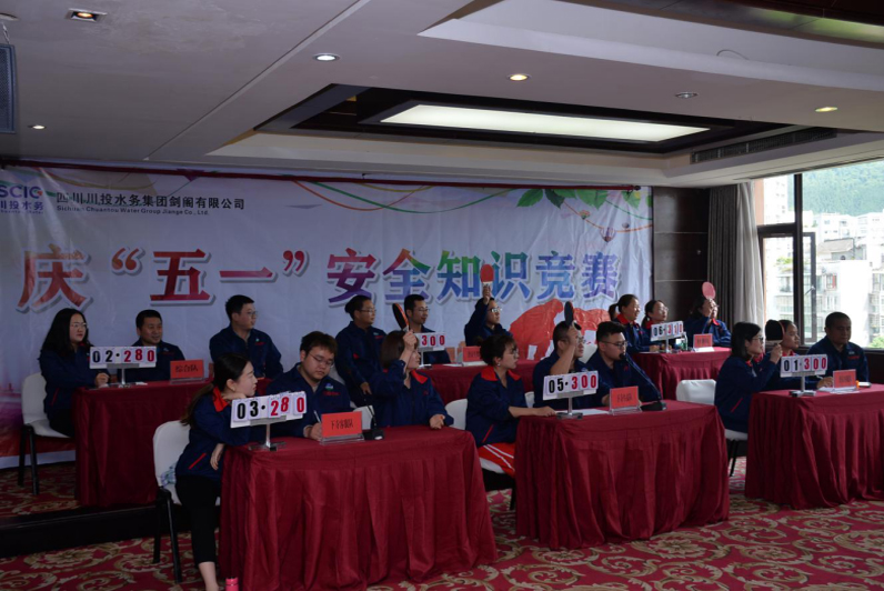 为庆祝“五一”国际劳动节,进一步增强职工安全生产意识,剑阁水司工会于2019年4月29日举办了庆“五一”安全生产知识竞赛活动。剑阁县总工会副主席王三才应邀莅临现场并担任评委,剑阁水司执行董事、总经理何天政,工会主席、副总经理韩名泉,副总经理杜刚参加了本次活动。