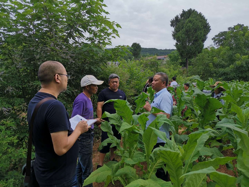 在田间地头,杜总查看烟叶的长势,询问农户水果的收成,农户庭院经济的规划和发展。在青山村种烟大户李孝林的烟地里,杜总与李孝林进行深入的交流,并对其聘请贫困户帮忙干农活挣工钱的做法十分认可。