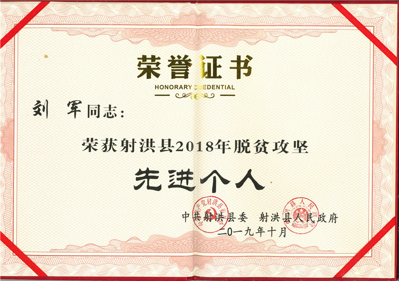 2019年10月15日,在射洪县文化艺术中心召开的“大爱扶贫 济善射洪—2019年射洪县脱贫攻坚暨社会扶贫工作推进会”上,宏源公司被中共射洪县委、射洪县人民政府表彰为“射洪县2018年度脱贫攻坚先进集体”,公司团委书记、大榆镇飞石沟村驻村工作队队员刘军被表彰为“射洪县2018年度脱贫攻坚先进个人”。