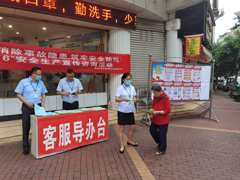 2020年6月是第19个全国“安全生产月”,根据必赢242net官网关于印发《2020年“安全生产月”活动》的通知精神,大英水司结合2020年安全生产月“消除事故隐患,筑牢安全防线”活动主题,在公司楼下设置咨询台,开展了宣传咨询活动。公司副总经理、安全分管领导王洪先,安监部、客服部、综合部相关人员参加了此次宣传活动。