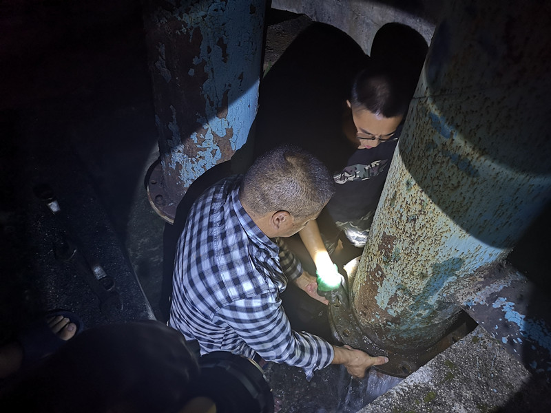 清洗队员由水厂负责人李明远亲自带队,从清水池进水口向出水口有序推进,埋头苦干的员工,分不清额头上是汗水还是水渍,仅听见笤帚清洗的水声在清水池四壁回响,水中的沉积物也在一行人的清洗中越来越少,身后流入的潺潺细流也变得清冽无比,在灯光照耀下粼粼泛光。
