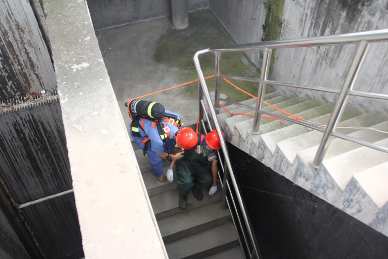 中江水司开展污水处理厂突发水质异常、有限空间作业中毒及触电事故应急演练